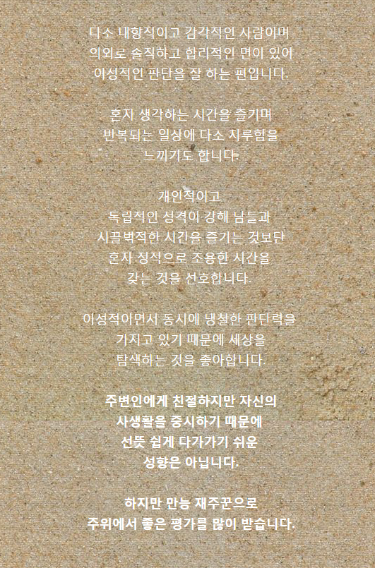 겉에 배경색이 모래 느낌에 흰색 텍스트라 가독성은 떨어지지만