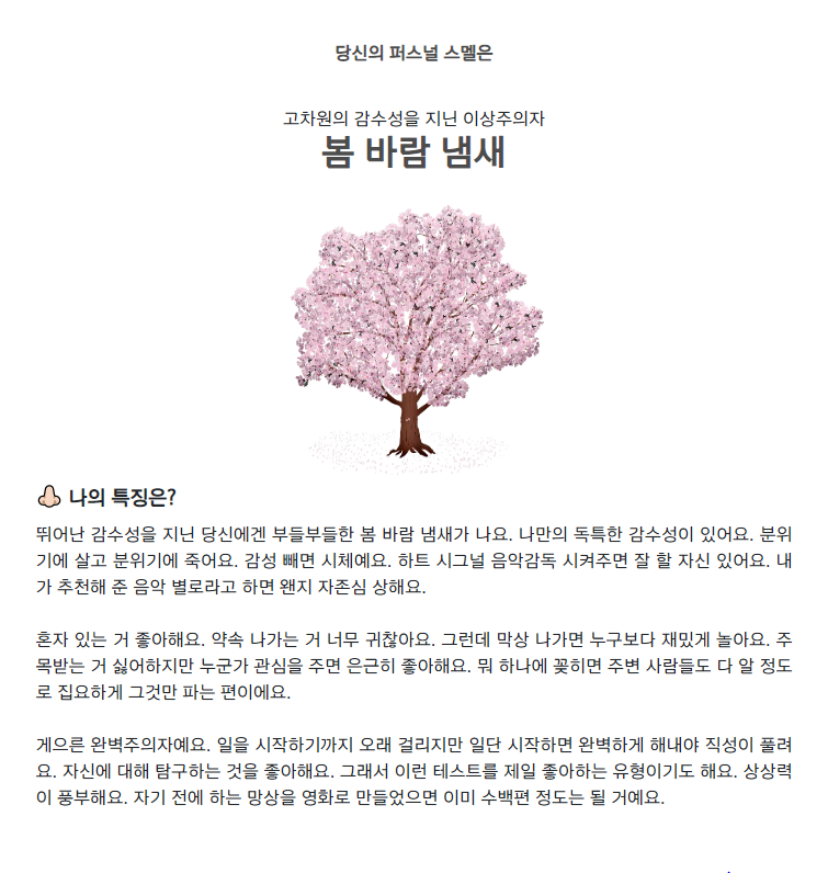 나의 이미지와 어울리는 냄새를 MBTI를 기반으로 찾아주는 테스트입니다.