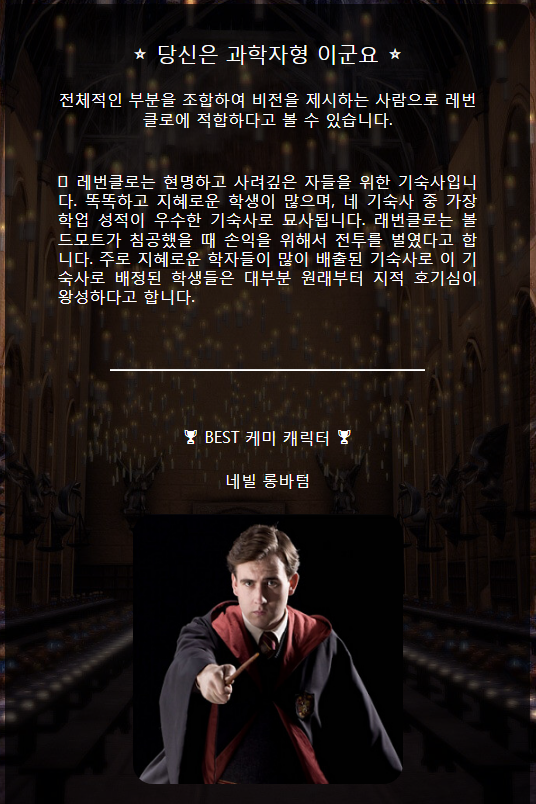 자신의 성향에 가장 잘 맞는 기숙사를 알아보는 테스트예요!