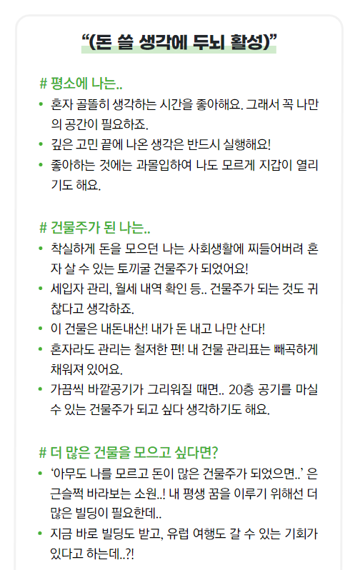평소 자신의 경제성향을 알 수 있는 문제들로 구성되어있어요